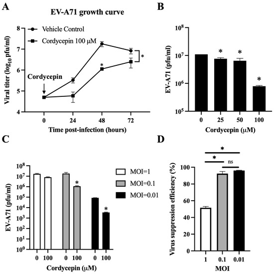 Cordycepin reduces the viral load of EV-A71 in Vero cells. EV-A71/MP4 viruses were added to Vero cell cultures at an MOI of 0.01, 0.1, or 1 in the absence or presence of 25, 50, or 100 μM cordycepin for 24, 48, or 72 h. Then, cultures (cells with supernatants) were harvested for viral titer detection using plaque assays. (A) One-step growth curves are shown. (B) The inhibitory effect on the viral load of different cordycepin doses at 48 h and (C) the inhibitory effect on the viral load of 100 μM cordycepin at different MOIs at 48 h were compared. (D) The viral suppression efficiency percentages were calculated from the viral titers of 100 μM cordycepin-treated groups relative to the vehicle control group under different MOIs at 48 h. Results are presented as mean ± SEM of three independent experiments. * p < 0.05 represents significant statistical difference. ns, no significant difference.