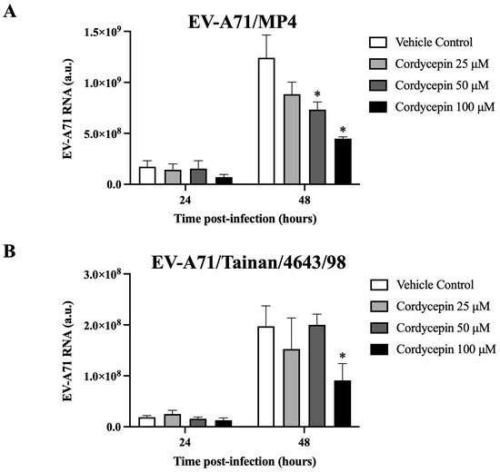 EV-A71 RNA level decreased in virus-infected Vero cells in the presence of cordycepin. (A) EV-A71/MP4 or (B) EV-A71/Tainan/4643/98 viruses were added to Vero cell cultures at an MOI of 0.1 in the absence or presence of 25, 50, or 100 μM cordycepin for 24 and 48 h. Then, cultures (cells with supernatants) were harvested for RNA isolation, followed by conversion to cDNA. Viral RNA levels were quantified by real-time RT-PCR with EV-A71-specific primer pairs, and normalized by the mRNA levels of GAPDH. Data are presented as mean ± SEM of three independent experiments. * p < 0.05 represents significant statistical difference compared to the vehicle control group. a.u., arbitrary unit.