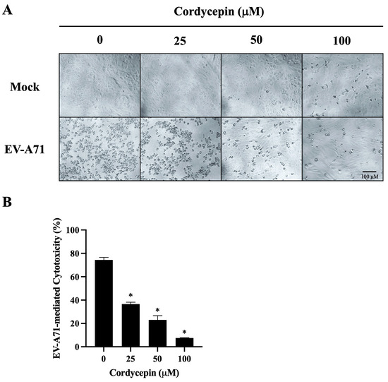 We further observed the morphological changes of mock- or EV-A71/MP4-infected Vero cells in the absence or presence of cordycepin at 96 h post-infection. As shown in Figure 4A, mock-infected Vero cells were firmly attached and exhibited the commonly anticipated polygonal-shaped morphology on the cell culture plates, regardless of whether cordycepin was administered or not; very few cells became rounded in the presence of 100 μM cordycepin. Conversely, cells infected with EV-A71/MP4 in the absence of cordycepin became rounded, more detached, with cell membrane blebbing and shrinkage, reflecting the severe CPE of cells caused by infection. The CPE induced by EV-A71 was alleviated with the increase in cordycepin concentration, and only a few cells exhibited a CPE in the presence of 100 μM cordycepin at 96 h post-infection (Figure 4A). In addition, under the mock infectious condition, there was no significant difference in the O.D. values of the cell viability test between the 25, 50, or 100 μM cordycepin-treated group and the nontreated control group (p > 0.05) (Figure S1A). This result indicates that the dose of cordycepin that we tested in this study does not induce obvious cytotoxicity to Vero cells. Under the condition of EV-A71 infection, the O.D. values of the 50 and 100 μM cordycepin-treated groups significantly increased by more than 2-fold compared with the nontreated control group (p < 0.05; Figure S1B). Markedly, the percentages of EV-A71-mediated cytotoxicity were significantly decreased by the increase in cordycepin concentration in a dose-dependent manner (p < 0.05) (Figure 4B).