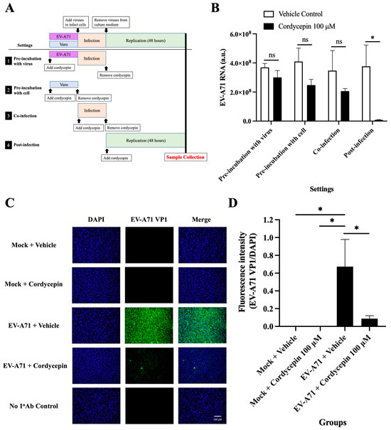 Cordycepin inhibits EV-A71 replication after cellular entry. To test the exact impact stage of the anti-EV-A71 effect of cordycepin, 100 μM cordycepin was administrated to the Vero cell cultures in four different experimental settings, including pre-incubation with virus, pre-incubation with cell, co-infection, and post-infection. (A) The period of the cordycepin action is shown in the illustration. (B) Then, cultures (cells with supernatants) were harvested for RNA isolation followed by conversion to cDNA. Viral RNA levels were quantified by real-time RT-PCR with EV-A71-specific primer pairs and normalized by the mRNA levels of GAPDH. The inhibitory effects of cordycepin were compared for different addition steps. (C) The numbers of EV-A71-infected cells after treatment with 100 μM cordycepin at the post-infection stage were examined at 48 h by immunofluorescence assay. EV-A71 VP1 protein was stained green by a specific antibody with Alexa Fluor 488-conjugated secondary antibody, and nuclei were stained blue with DAPI. (D) The fluorescence intensity ratios of EV-A71 VP1 per DAPI were analyzed with ImageJ software. Data are presented as mean ± SEM of three independent experiments. * p < 0.05 represents significant statistical difference. ns, no significant difference.