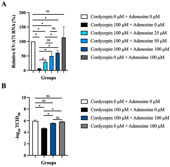 Exogenous adenosine reduces the anti-EV-A71 effect of cordycepin. (A) Vero cells were infected by EV-A71/MP4 at an MOI of 0.1, and then treated with or without 100 μM cordycepin and increasing doses of adenosine after 1-h virus adsorption. Cultures (cells with supernatants) were harvested for RNA isolation at 48 h post-infection, followed by conversion to cDNA. Viral RNA levels were quantified by real-time RT-PCR with EV-A71-specific primer pairs and normalized by the mRNA levels of GAPDH. Data are presented as mean ± SEM of three independent experiments in percentages relative to the control group (cordycepin 0 μM + adenosine 0 μM). (B) Vero cells were infected with a serial dilution of EV-A71/MP4 in a 96-well plate, and then treated with or without 100 μM cordycepin and adenosine (0 or 100 μM) after 1-h virus adsorption. After 72 h, CPE was examined and TCID50 values were calculated using the Reed and Muench formula. Data are presented as mean ± SEM of three independent experiments. * p < 0.05 represents significant statistical difference. ns, no significant difference.