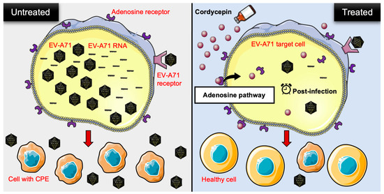 Our study reveals a novel finding that cordycepin exhibits anti-EV-A71 activity. It not only inhibits EV-A71 replication, but also protects host cells from EV-A71-induced cytotoxicity. The inhibitory effect can be reproduced in different EV-A71 permissive cells, and in response to different EV-A71 strains. Cordycepin achieves its anti-EV-A71 effect after the virus enters the cell, and mainly acts through the adenosine pathway (Figure 8). Our findings suggest that cordycepin has potential as a drug candidate for treating EV-A71 infection. The future applications of cordycepin may involve its use in treating mild EV-A71 infections, such as HFMD or herpangina, to alleviate symptoms, shorten the clinical course, and reduce the risk of severe complications.