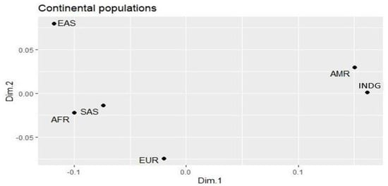 Information from markers indicative of ancestry (AIMs) was obtained to confirm the ancestry and the mixture between continental populations (European, African and Asian) in three multiplex PCR reactions [,,]. Electrophoresis was used to analyze the amplicons in the sequencer ABI Prism 3130 and GeneMapper ID v.3.2. In addition, the proportions of the individuals were analyzed in the STRUCTURE v.2.33 software. The allele frequency data of the INDG population were obtained by the allele count and compared with data from 5 other continental populations (AFR, AMR, EAS, EUR and SAS) found in the Project 1000 Genomes database (http://www.1000genomes.org; accessed on March 30th, 2022).