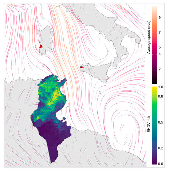 To create risk maps from a regression model, it is necessary to have spatial data layers for all covariates in the model. The use of other covariates like wind [50], drought severity [51,52,53], animal movement, and variables related to herd management or individual animal level factors may help to further improve predictions. In the case of wind, this variable can influence the distribution of C. imicola at large scales [43], and can also affect its propagation [52]. The translocation of C. imicola can lead to the spread of viruses associated with the vector to new places, as has occurred with BTV between Mediterranean islands [54]. In the case of EHDV, serotype 8 may have spread from Tunisia to Italy (Sardinia and Sicily) through C. imicola transported by wind currents that go from the African to the European continent. The EHDV risk map locates the areas of greatest risk in the north-east of the country, which in turn are crossed by strong wind currents (Figure 4). Strong winds may have carried infected C. imicola from Tunisia to the Mediterranean islands, spreading the disease and producing the first cases of EHD due to serotype 8 infection in Europe [14]. Since the first cases of this serotype in Tunisia in 2021, the virus may have persisted throughout the year. The following year, in 2022, as it was already widely distributed throughout the country, the virus could have spread to the Italian islands. In Figure 4, south winds blowing towards Sardinia (dated 23 October 2022) are shown, where infected vectors could potentially reach the coast of the island. Similarly, 10 days earlier, on October 13th, west winds blowing towards Sicily may explain the cases detected in this Italian island, which is closer to Tunisia (Ventusky 2023: https://www.ventusky.com/?p=35.1;7.1;5&l=wind-10m&t=20221013/1200, last accessed on 16 October 2023).