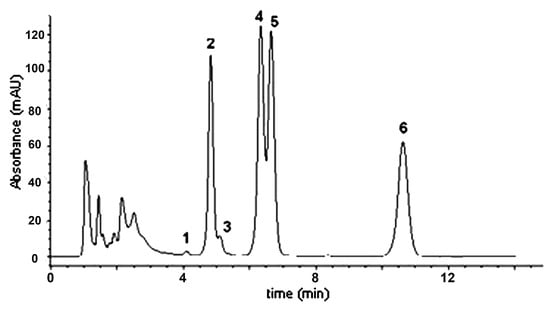 Pentacyclic oxindole alkaloid HPLC-UV profile of the studied Uncaria tomentosa extract assayed: 1: Speciophylline; 2: Mitraphylline; 3: Uncarine F; 4: Pteropodine; 5: Isomitraphylline; 6: Isopteropodine (Figure from [41] with CC-BY attribution).