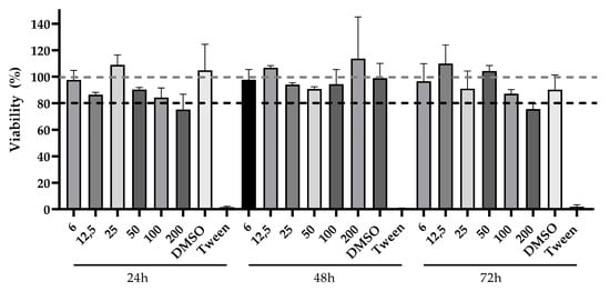 The cytotoxicity of different concentrations of UT extract was assessed by treating Vero cells for up to 72 h through the MTT assay. Untreated cells were used as a reference for 100% viability, and concentrations that maintained viability lower than 80% in all three time points were considered cytotoxic. After 24 h, cells treated with 200 µg/mL had 75.3% viability, indicating cytotoxic properties of the extract in this concentration. In 48 h treatment, cell viability was higher than 90% in all tested concentrations, while 72 h treatment with 200 µg/mL decreased viability to 75% once again. Tween at 3% was included as cytotoxicity control. The tested concentrations of 6 to 100 µg, as well as 0.4% of DMSO (vehicle control), kept cell viability above 80% in all time points (Figure 2) and were, therefore, used in the antiviral activity investigation assays. Cell viability was reduced when Vero cells were treated with higher amounts (200 µg/mL) of extract at 24 h and 72 h as well.