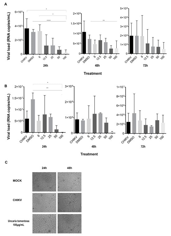 Antiviral activity of Uncaria tomentosa against CHIKV infection. (A) Extracellular and (B) Intracellular CHIKV RNA quantification by RT-qPCR of CHIKV-infected Vero cells at an MOI of 0.01 and treated with different concentrations (6–100 µg/mL) of hydroalcoholic extract of UT for 24, 48 h, and 72 h. The data represent the means and standard deviation (±SD) of three independent experiments in duplicates. * p < 0.05, one-way ANOVA followed by Turkey test. Linear regression analysis after conversion to logarithm of the doses, significant ++ p < 0.01, ++++ p < 0.0001 indicated. (C) Cell morphology of Vero cells at 24 and 48 h p.i. Representative images of negative control (Mock), positive control (CHIKV infected), and CHIKV-infected cells after treatment with 100 µg/mL.