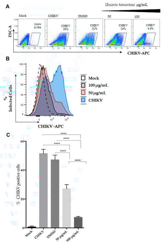 Flow cytometric analysis for quantification of treated and untreated CHIKV-infected cells. (A) Representative dot plot analysis (FSC × CHIKV-Alexa-647). The CHIKV-positive cells are represented in the gates. From left to right, mock (negative control), CHIKV (positive control), DMSO (vehicle control), 50 µg/mL, and 100 µg/mL of UT are represented. (B) Histogram analyses showing the percentage of positive cells for each condition: negative control (Mock, dashed line), CHIKV (positive control, blue), and UT at 50 µg/mL (red) and 100 µg/mL (gray), respectively. (C) Percentage of positive cells determined by flow cytometry. Two independent experiments in duplicates. Data are expressed as mean (±SD). **** p < 0.0001, one-way ANOVA followed by Turkey test.