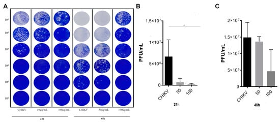 RT-qPCR is a widely used technique in antiviral research, given its high sensitivity and specificity to quantitate virus RNA. Our study uses a previously described protocol with sensitivity to detect 0.3 PFU [40] as a tool to detect CHIKV RNA. Simultaneously, we tested the virus infectivity using plaque assay, the gold standard for quantification of lytic virus [68] that confirmed CHIKV infectivity reduction after 24 h and 48 h treatment with 100 µg/mL.