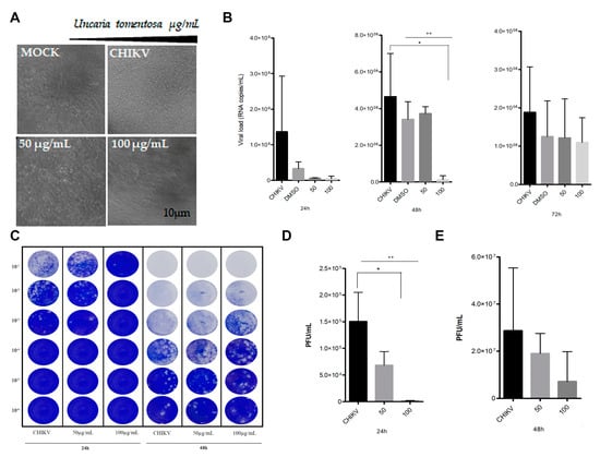 Since we detected the UT virucidal effects against CHIKV, the 100 and 50 µg/mL concentrations were tested using plaque reduction assay. Supernatants were collected at 24 h and 48 h p.i, and the viral load was titrated. Confirming the RT-qPCR findings, treatment with 100 µg/mL caused a significant reduction in viral infectivity at 24 h p.i with a 98% decrease in viral load (Figure 6C,D). The difference between CHIKV-positive control and UT treatment was not statistically significant after 48 p.i. However, there was a 75% reduction in viral load (Figure 6E). These results revealed that hydroalcoholic extract of UT at a concentration of 100 µg/mL also showed virucidal activity against CHIKV-infected Vero cells in vitro.