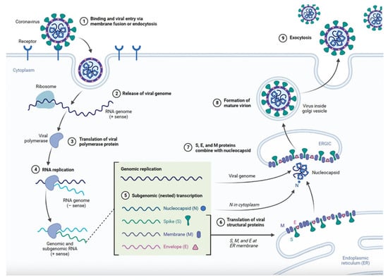 - V’Kovski, P.; Kratzel, A.; Steiner, S.; Stalder, H.; Thiel, V. Coronavirus biology and replication: Implications for SARS-CoV-2. Nat. Rev. Microbiol. 2021, 19, 155–170. [Google Scholar] [CrossRef] [PubMed]