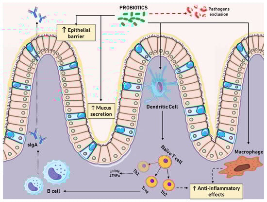 The complex link between microbiota composition and human health is evident from the significant variations in gut microbiota observed between healthy individuals and those with various diseases and pathologies. These differences have implications not just for the intestine but also for mucosal tissues and the entire body [36,37]. Probiotics are key in modulating the gut microbiota and the immune system (Figure 2). Their roles include exerting antiallergic effects, anticancer activities, influencing inflammatory intestinal diseases, and impacting neurological disorders [38]. The metabolites produced by probiotics are gaining recognition for their importance in facilitating host–microbe interactions, which can be nutritionally influenced. These metabolites can improve intestinal barrier function, promote gastric motility and hormonal secretion, offer anti-inflammatory and antioxidant benefits, synthesize neurotransmitters, and alter the gut microbiome’s composition and metabolism [38,39,40]. Additionally, probiotics can prevent pathogens from adhering to mucosal cells and modulate the host’s immune response, further strengthening the intestinal barrier [41].