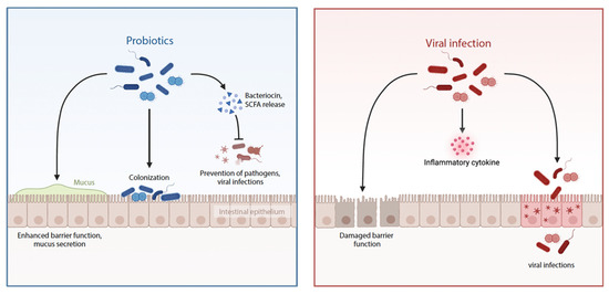 Viral infectious diseases are a major contributor to the global burden of death and disability in both developed and developing countries [67,68]. A healthy and diverse microbial population, predominantly situated in the intestines, can protect the human host from various pathogenic diseases through a range of mechanisms, exerting substantial inhibitory effects [69]. Consequently, probiotics serve as a supportive approach, offering beneficial effects against viral infections by bolstering the immune response, maintaining the integrity of the protective cellular layer, and interacting with harmful microorganisms to impede their attachment (Figure 3).