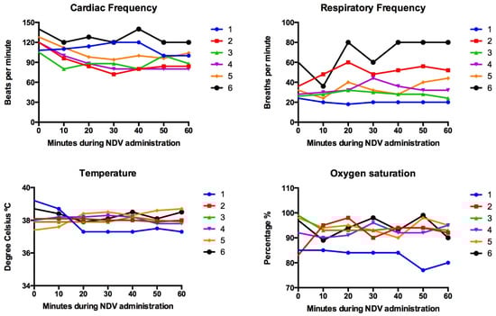 Simultaneous intravenous and intratumoral injection of NDV-MLS to companion dogs with mammary cancer did not cause clinically relevant alteration in their vital signs. Parameters were recorded during the hour following viral infusion. Each color line represents a dog. Dogs were identified as 1–6.