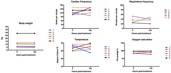 Regarding constitutional clinical signs, 2/6 dogs showed grade I AE (mild lethargy/fatigue/general performance), which lasted less than 3 days; weight loss grade 1 (<10%) was detected in 4/6 dogs; and fever grade I (39.5–40 °C) was documented in 3/6 dogs (2 at day 6 and 1 at day 2, post-virus administration). Anorexia grade I was reported in 4/6 dogs (coaxing or dietary change required to maintain appetite). Respiratory abnormalities were noted in 2/6 dogs: one dog (patient No. 5) had mild nasal discharge (grade I) for 3 days; and another dog (patient No. 1) showed a decrease in sO2 (from 84% to 77%, grade II), with no other associated clinical signs. The owners of patient No. 1 declined additional tests or procedures to further investigate the decrease in the sO2 due to the absence of other clinical signs and because the dog was doing well at home (Figure 2).