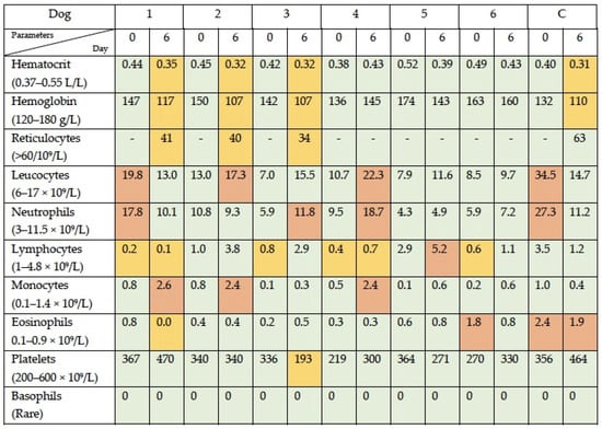 CBC parameters documented outside the reference range at day 6 post-viral administration were as follows. Three dogs (patients 1, 2, and 3) developed mild anemia (grade I), which was non-regenerative; two dogs (patients 3 and 4) developed mild neutrophilia; three dogs (patients 1, 2, and 4) developed monocytosis; one dog (patient 5) developed lymphocytosis; one dog (patient 1) showed eosinopenia; one dog (patient 3) had a decreased in the platelet count (grade I); and of four patients with decreased lymphocytes at baseline, the parameter remained decreased in two (patients 1 and 4) and normalized in two (patient 3 and 6). The control dog developed a mild regenerative anemia, her basal elevated neutrophil count normalized, and her basal eosinophilia improved (Figure 3).