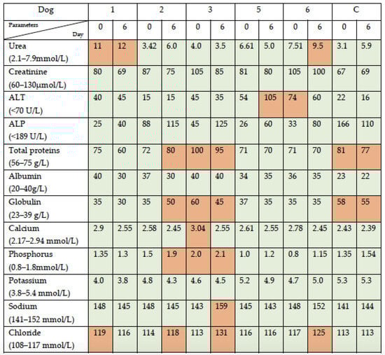 The SBP parameters documented outside the reference range at day 6 post-viral administration for five of the six dogs (patients 1, 2, 3, 5, and 6) were as follows. One dog (patient 6) developed elevated urea, but her creatinine remained within normal limits, and one dog (patient 1) with elevated urea baseline remained with this value elevated; one dog (patient 5) developed elevated ALT (grade I); one dog (patient 2) developed elevated globulins, and one dog (patient 3) who had elevated globulins at baseline remained with this value elevated; one dog (patient 2) showed a mild increase in phosphorus, and another dog (patient 3) with mild elevated phosphorus at baseline remained with this value mildly elevated; a mild increase in sodium was noted in one dog (patient 3); and three dogs (patients 2, 3, and 6) showed a mild increase in chloride. The serum chemistry on day 6 was not performed on patient 4 due to an insufficient sample. The control dog only showed hyperproteinemia due to hyperglobulinemia at baseline and remained similar at day 6, with no other changes documented (Figure 4).