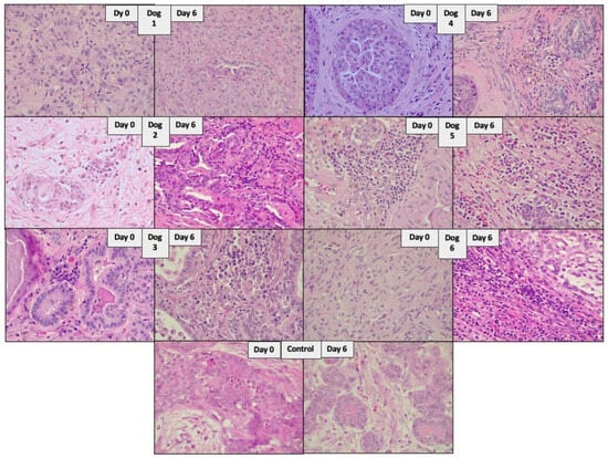 Representative microscopic images of tumor tissues of female companion dogs with spontaneous mammary cancer receiving the NDV-MLS (dogs 1–6). Images of the control dog receiving the viral vehicle are included (control). Images show H&E slides 40× of the tumor samples on day 0 and day 6 after viral administration.