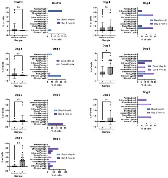 Variations in the tumor cell infiltrates after NDV-MLS administration. For each dog, the graphic on the left shows the differences between the tumor immune cells at baseline (day 0) vs. post-viral treatment (Day 6); and the graphic on the right shows the variation in the different cells and compartment. Peri, peritumoral; Intratum, intratumoral; Strom, stromal; Neutroph, neutrophils; Plasma, plasma cells; Macroph, macrophages; Lymph, lymphocytes; ns, non-significant; */** = p < 0.05. The tumor immune cell infiltrates at day 6 post-viral administration were statistically different in dogs 3 and 5, compared to their respective baseline (day 0) values.