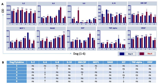 Variations in plasma cytokines after NDV-MLS administration. (A) Differences between baseline (day 0) and post-viral treatment (day 6) samples for individual plasma cytokines per dog are shown (* p < 0.05; ns, non-significant; OD, optical density). (B) Summary of the plasma cytokines variations (ns, non-significative changes; black arrows indicate the change between day 0 and day 6; arrow up means the value increased; arrow down means the value decreased).