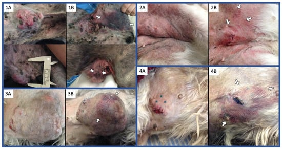 Local adverse event to NDV-MLS administration. Bruising around the injected tumor site and/or at the periphery of the injected tumor (white arrows) was noted in 4/6 dogs. Pictures pre-post (A) and post-virus (B) administration of the 4 affected patients (dogs 1–4) are shown.