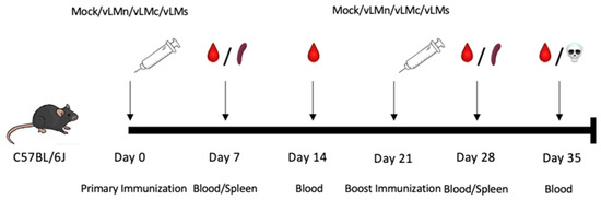 Schematic of the timeline for animal experiments. Vaccines (vLMn, vLMc, and vLMs) and mock vaccine (LNPs-Cap1-mRNA-Luc) were used to immunize C57BL/6J mice via i.m. at day 0 and day 21. Blood samples were collected at days 7 and 14 (7 and 14 days after the primary immunization) and at days 28 and 35 (7 and 14 days after the boost immunization) for ELISA assay. Spleen samples were collected at day 7 (7 days after the primary immunization) and at day 28 (7 days after the boost immunization) for ELISPOT assay.