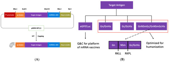 Genomic structure of mRNA template. (A) Corresponding Cap1-mRNA were synthesized by IVT and capping using constructed pGEM-3Zf (+) mt including target antigen as templates; 5′UTR was α-globin, 3′UTR was mtRNA1-AES, and poly A tail included 120 A. The short arrows indicate enzyme digestion. (B) Target antigens were eGFP, Luc, Gn, GnHis, Gc, GcHis, GnNSmGc, and GnNSmGcHis. The red box indicates immunogen genes encoding CCHFV glycoprotein that were only codon-optimized for humans. The dotted line indicates that GnNSmGc and GnNSmGcHis could be digested to Gn, NSm, and Gc/GcHis by SKI-1/S1P and SKI-1/S1P-like enzymes. The short arrows indicate sites for enzyme digestion.