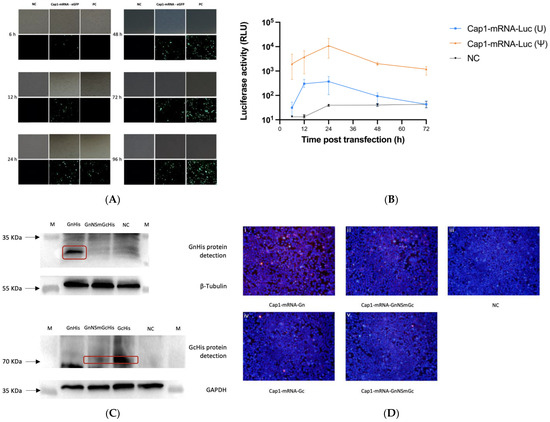 To determine antigen expression, Cap1-mRNA-eGFP and Cap1-mRNA-Luc were synthesized by IVT and the capping kit. Through the transfection of Cap1-mRNA-eGFP and the positive control (PC) plasmid in 293T cells, the results indicated that eGFP was successfully expressed by Cap1-mRNA at 6 h, and by the PC plasmid at 24 h (Figure 3A). Furthermore, after the detection of Cap1-mRNA-Luc translation in 293T cells, it was clearly observed that the efficiency of modified mRNA was better than that of unmodified mRNA. Meanwhile, Luc activity peaked at 24 h and was found to be sustained at least to 72 h (Figure 3B). Additionally, GnHis (35 KDa) and GcHis (72 KDa) proteins were successfully expressed by relevant Cap1-mRNA in 293T cells (Figure 3C). As expected, GnNSmGcHis was digested to individual Gn and GcHis proteins by SKI-1/S1P and SKI-1/S1P-like enzymes (Figure 3C). Meanwhile, the results of immunofluorescence assays further demonstrated the expression of CCHFV glycoprotein Gn by both Cap1-mRNA-Gn (Figure 3(Di)) and Cap1-mRNA-GnNSmGc in 293T cells (Figure 3(Dii)). Interestingly, compared to Gc expressed by Cap1-mRNA-Gc, Gc expressed by Cap1-mRNA-GnNSmGc was weaker, which was consistent with the immunoblotting results (Figure 3C,(Div,Dv)).