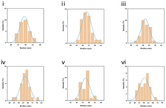 Intensity size graph of LNPs-Cap1-mRNA measured by dynamic light-scattering method. The physical characteristics of LNPs generated by methods 1, 2, 3, 4, 5, and 6 in Table 3 correspond to panels (i), (ii), (iii), (iv), (v), and (vi), respectively.