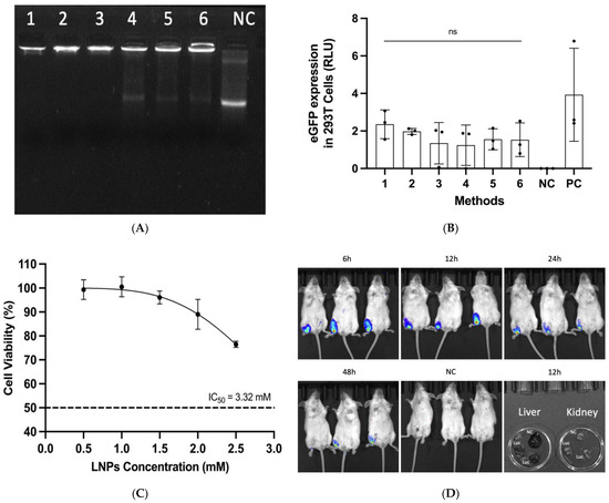 (A) Gel retardation assay. LNPs-Cap1-mRNA manufactured by methods 1–6 in Table 3 were run on 1.2% nuclease-free agarose gel. NC indicates negative control using naked Cap1-mRNA; (B) detection of expression intensity of LNPs-Cap1-mRNA-eGFP manufactured via methods 1–6 in 293T cells; naked Cap1-mRNA-eGFP as NC. Cap1-mRNA-eGFP encapsulated by LipofectamineTM 2000 Reagent as PC. Data are shown as mean ± SD, and there are no significant differences between different methods. (C) Cytotoxicity of LNPs-Cap1-mRNA was detected on 293T cells. The dotted line indicates a deductive IC50 of 3.32 mM. (D) In vivo bioluminescence image in mice. Female BALB/c mice were administered 10 μg of LNPs-Cap1-mRNA-Luc via the i.m. route and observed at 6 h, 12 h, 24 h, and 48 h post-vaccination. The liver and kidneys were observed at 12 h post-vaccination. The same volume of PBS via the i.m. route was used for the NC group.