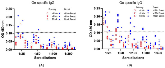 Specific IgG antibodies titer in C57BL/6J due to vaccination by mRNA vaccines. (A) Sera were collected from the vLMn and vLMs vaccine groups after primary and boost immunization, and the antibody titers of IgG targeting Gn were detected; (B) Sera were collected from vLMc and vLMs vaccine groups after primary and boost immunizations, and the titer of IgG antibodies targeting Gc was detected. The dotted lines represent the limit of detection.