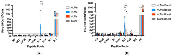 To evaluate cellular immune responses from immunized mice, splenocytes were collected at 7 days after each immunization. Fresh splenocytes from four groups (n = 5 per group) were pooled and incubated with peptides based on CCHFV pools spanning GPC. We conducted IFN-γ and IL-4 ELISPOT assays to characterize whether T-cell immune responses were skewed towards Th1 or Th2. Interestingly, neither initial nor boost immunization of vLMn induced IFN-γ in response to any peptide stimulation (Figure 7A,B). Initial immunization of vLMc generated detectable T-cell responses (ranging from 12 to 844 SFCs/106 splenocytes) to the Gc1 peptide (Figure 7A), and it became stronger (ranging from 286 to 648 SFCs/106 splenocytes) after boost immunization (Figure 7B). However, IFN-γ-secreting cells were not detected after initial immunization with vLMs (Figure 7A). Even after boost immunization, the T-cell immune response of the vLM group to the Gc1 peptide was comparatively lower (ranging from 70 to 232 SFCs/106 splenocytes) than that of the vLMc group(Figure 7B). Interestingly, non-specific responses of IL-4 were detected for the three vaccine candidates with the ELISPOT assay (Figure S3).