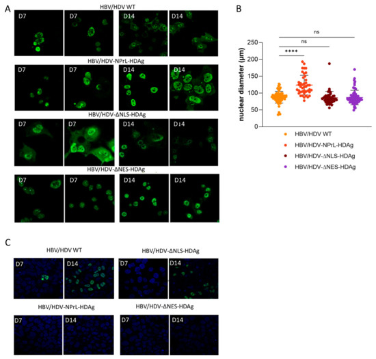 Then, we analyzed the formation of HDV infectious particles in the supernatant of transfected cells. For this purpose, cell supernatant was harvested on days 7 and 14 and used to infect Huh-7 cells stably expressing hNTCP. A minimal number of infected cells were observed when cells were incubated with day 7 supernatants, but the count significantly increased when using day 14 HDV-WT supernatants. While infectious particles were detected in the supernatant from ΔNLS-HDAg transfected cells, none were observed in the supernatants of NPrL-HDAg- or ΔNES-HDAg-transfected cells (Figure 2C).