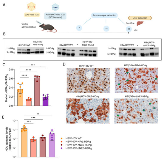 3.3. In Vivo Analysis of HDV-NPrL-HDAg, HDV-ΔNLS-HDAg, and HDV-ΔNES-HDAg Mutants