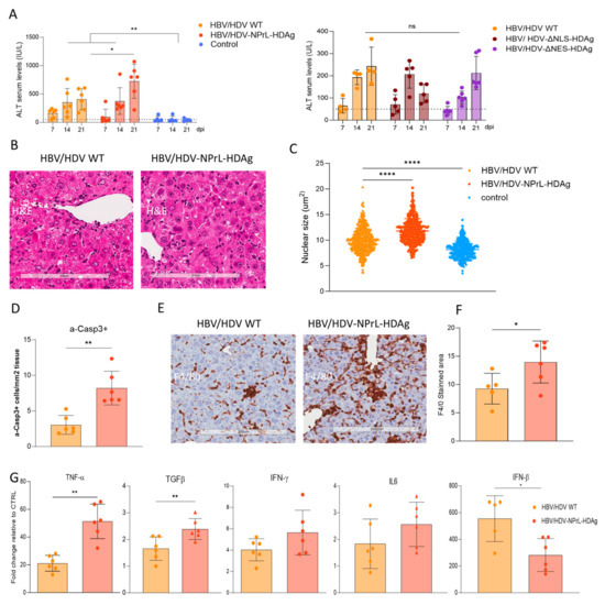An analysis of liver pathology. (A) Peripheral blood was collected every 7 days for 3 weeks to measure ALT concentration in the serum (as described in Figure 3A). Individual data points and mean values ± standard deviation were plotted, and significant differences between groups at each time point were determined by a mixed-effect analysis and multiple comparisons (* p < 0.05, ** p < 0.01). (B) Liver sections from HBV/HDV WT- and HBV/HDV-NPrL-HDAg-injected mice obtained on 21 dpi were analyzed by H&E staining, revealing more abundant degenerated nuclei in the HDV-NPrL-HDAg mutant. Scale bar: 200 μm. (C) The nuclear diameter was significantly larger in the HDV-NPrL-HDAg group, as determined by an unpaired t-test (**** p < 0.0001). (D) Immunostaining against activated caspase 3 (a-casp3) revealed that the HDV-NPrL-HDAg mutant exacerbated hepatocyte death by apoptosis, with differences between the two groups revealed by a Mann–Whitney test. (D–F) Liver sections were stained with anti-F4/80 to determine the presence of macrophages, showing a significantly higher presence in the HDV-NPrL-HDAg group. Scale bar: 200 μm (* p < 0.05, ** p < 0.01). (G) The expression of different cytokines in the liver of HBV/HDV WT and HBV/HDV-NPrL-HDAg was analyzed by RTqPCR and compared to those in untreated control animals, revealing differences between the two groups (* p < 0.05, ** p < 0.01). A Mann–Whitney test was applied for the statistical comparison of the two groups.