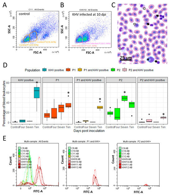 Peripheral blood leukocyte analysis in common carp infected with koi herpesvirus (KHV). (A,B) Pseudo-colour density dot plot showing the forward scatter (FSC) and side scatter (SSC) properties of blood leukocytes from (A) a control carp and (B) a KHV-infected carp sampled at ten days post infection (dpi). Two populations were gathered: P1 and P2. (C) Giemsa-stained blood smear photomicrograph of an infected carp at ten dpi. Black arrows: lymphocytes-like; open arrows: monocytes-like; asterisk: neutrophil-like. (D) Box plots showing the percentage of KHV-positive leukocytes, P1 and P2 populations in blood leukocytes, and the percentage of KHV positive cells in P1 (P1 and KHV positive) and P2 (P2 and KHV positive). Control group: 12 fish; KHV-infected group: four fish per each sampling point (four, seven, and ten dpi). Asterisk (*) denotes a significant difference (t-test p-value < 0.05) in the number of cells between control and infected carp. (E) Flow cytometry analysis of peripheral leukocytes of four control fish (C9, C10, C11, C12) and four KHV-infected fish (KHV9, KHV10, KHV11, KHV12) sampled at ten dpi stained with an anti-KHV antibody conjugated with Alexa Fluor 488. Leukocytes from KHV-infected carp showed increased fluorescence on the FITC channel in both P1 and P2 populations.