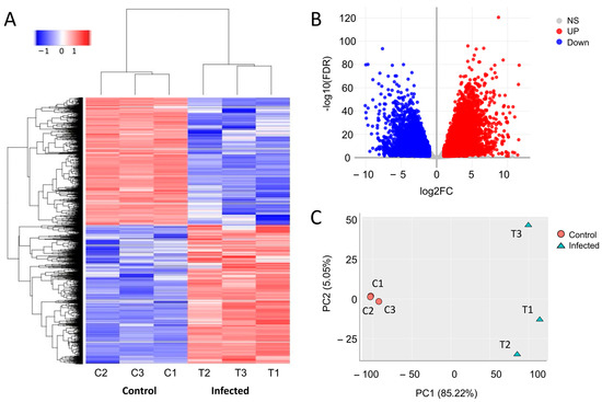(A) Heatmap showing hierarchical clustering of all differentially expressed genes in common carp naïve leukocytes (samples C1, C2, and C3) and leukocytes infected with koi herpesvirus (KHV) (samples T1, T2, and T3). (B) Volcano plot showing up-regulated (up) and down-regulated (down) genes (p < 0.05, FC > 2) and genes found expressed but not significantly different from controls (NS) (p > 0.05). (C) Principal component analysis (PCA) plot of control (C1, C2, and C3) and KHV-infected (T1, T2, T3) common carp leukocytes sampled at ten days post infection.