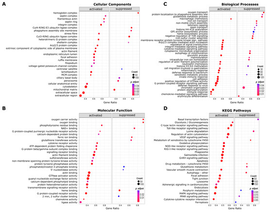 Enriched gene ontology (GO) terms and Kyoto Encyclopedia of Genes and Genomes (KEGG) pathways in Koi herpesvirus-infected common carp blood leukocytes. Enrichment of GOs belonging to (A) cellular components, (B) molecular function, (C) biological processes, and (D) enriched KEGG pathways. The size and colour of each dot represent the number of genes and adjusted p values, as depicted in the legend (Benjamini–Hochberg correction; FDR < 0.05), respectively.