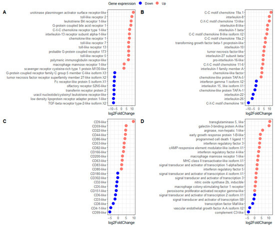 Carp macrophage phenotype in response to koi herpesvirus infection (KHV). Gene expression (log2 fold change) of either up- or down-regulated (A) cellular receptors, (B) interleukins, (C) cluster of differentiation (cd), and (D) other genes informative for macrophage phenotyping.