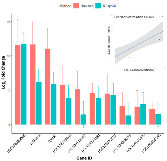 Bar plot showing a comparison of the RT-PCR and RNA-Seq fold change values obtained for ten selected genes. Error bars represent 95% confidence interval (fold change ± 1.96 × SD), number of fish were three KHV-infected fish for the RNA-Seq analysis and four KHV-infected and control carps for the RT-qPCR tests, all sampled at ten days post infection. The inset scatter plot highlights the high correlation found between both methods. Genes ID: LOC109089066 urokinase plasminogen activator surface receptor-like, GenBank accession number XM_042747598.1; ccl19a.1 C-C motif chemokine 19a.1, XM_019104238.2; tgm5l transglutaminase 5-like, XM042725334.1; LOC122139442 arginase, non-hepatic 1-like, XM_042737121.1; LOC109112007 CD59 glycoprotein-like, XM_019125028.2; LOC109074181 CD44 antigen-like isoform X2, XM_042752900.1; LOC109072573 CD83 antigen-like, XM_019119505.2; LOC109058299 solute carrier family 40 member 1, XM_042730488.1; LOC109075423 macrophage mannose receptor 1-like, XM_042718436.1; and LOC109106145 allograft inflammatory factor 1-like isoform X1, XM_019088805.2. Note the plot does not show the fold change of the carp interleukin-10 (il10, XM_042734270.1) which was only detected in KHV-infected samples.