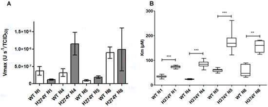 Vm and Km for reverse genetic influenza A viruses bearing WT or H274Y-substituted NA according to the NA subtypes on initial MDCK supernatants. Vm normalised by a viral titre in TCID50 are presented on the left part of the figure (A), and Km are presented on the right part of the figure (B). Data presented are mean values ± standard deviation for normalised Vm, and mean values and minimal and maximal values for Km. The results were analysed by a Mann–Whitney test using Graphpad (Prism) software. The significant differences between the viruses bearing WT and corresponding H274Y-NA were presented (** p < 0.01, and *** p < 0.001).