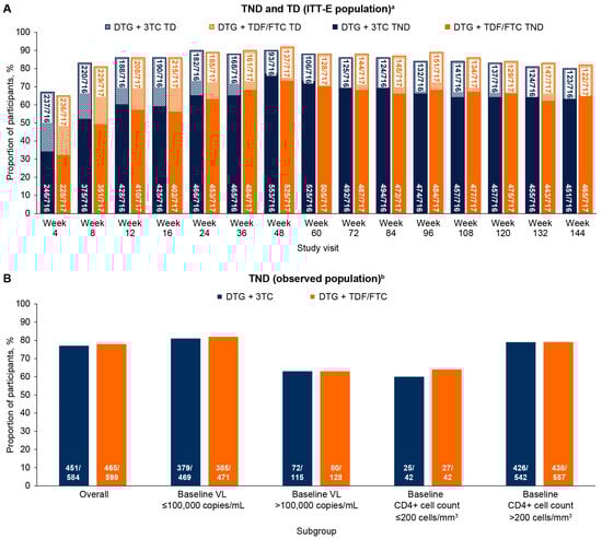(A) Proportion of participants with TND and TD through Week 144 (ITT-E population). (B) Proportion of participants with TND by baseline subgroups at Week 144 (observed population). DTG, dolutegravir; FTC, emtricitabine; ITT-E, intention-to-treat–exposed; 3TC, lamivudine; TD, target detected; TDF, tenofovir disoproxil fumarate; TND, target not detected; VL, viral load. a The denominator at the base and top of each bar represents the total number of ITT-E participants. b The denominator at the base of each bar represents the total number of ITT-E participants with VL < 50 copies/mL at Week 144.