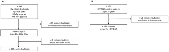Flowchart for study selection. (A): group A, subjects with HIV; (B): group B, subjects with HCV. Boxes and arrows represent the subgroup populations.