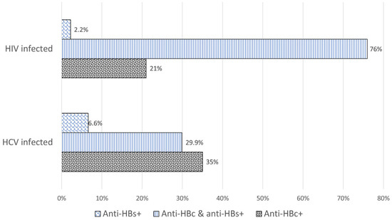 By contrast, the patterns of HBV serological biomarkers between the whole set of patients from group A and patients from group B who tested positive for at least one biomarker were different (Figure 2). The frequency difference of samples positive for anti-HBc and anti-HBs (76% among HIV-infected vs. 29.9% among HCV-infected) was highly significant (p < 0.001), and, conversely, the relative frequency of samples positive for anti-HBc was only significantly higher in patients with HCV than in patients with HIV (35% vs. 21%; p < 0.005). There was no clear gender-related difference, as anti-HBc positives were only higher in HIV-positive females but lower in HCV-positive females (Table 2).