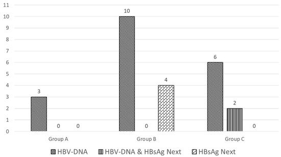 Positivity for HBV-DNA and/or for HBsAg by the HBsAg NEXT assay in three groups of subjects. Group A = subjects with HIV; group B = subjects with HCV; Group C = subjects with low HBV-DNA levels. The frequency of positivity for HBV-DNA in groups A and B was 0.6% and 7.3%, respectively (p < 0.0001).