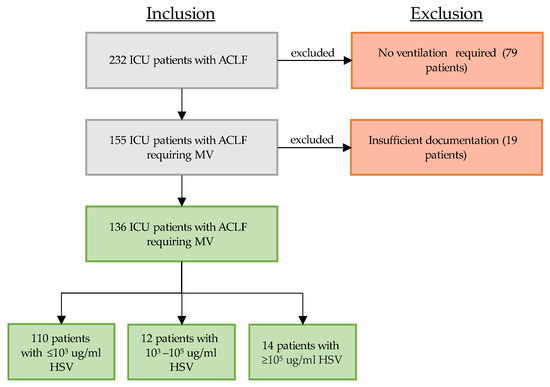 During the study period, 232 patients with ACLF were treated in our ICU and were eligible for study inclusion (see flowchart, Figure 1). Out of these 232 patients, 155 patients (66.8%) required mechanical ventilation. A total of 19 patients were excluded due to insufficient documentation. All of the remaining 136 patients underwent viral and microbiological testing in respiratory samples (either BAL or NBL) upon clinical deterioration. Of these 136 patients, 26 patients (19.1%) tested positive for at least 103 Geq/mL HSV. Only 14 of these positively tested patients showed high viral load of pulmonary reactivated HSV (≥105 Geq/mL, 10.3%, HSV group).