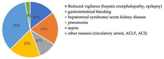 The reasons for ICU admission for all 136 patients were diverse: 35% of the patients were admitted due to sepsis, 19% due to gastrointestinal bleeding, 18% due to respiratory failure, and 15% due to reduced vigilance (mostly because of hepatic encephalopathy) (see Figure 2).