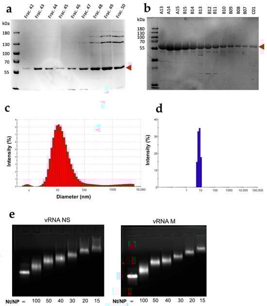 Characterization of the WSN NP protein. Fractions obtained after the last chromatographic step performed at high [] (a) or low ionic strength (b) were analyzed using SDS PAGE. The DLS profiles of the proteins purified in (a,b) are shown in panels (c,d), respectively. (e) Ten pmoles of NS (left) or M (right) vRNAs were incubated with increasing amounts of NP protein purified at low ionic strength at the nt/NP ratios indicated below the lanes and analyzed by electrophoresis through a 1% agarose gel containing 0.5 µg ethidium bromide per ml.
