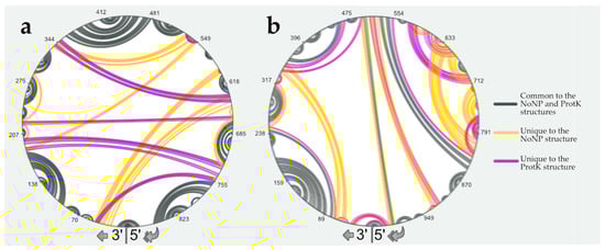 Comparison of the predicted secondary structures under the NoNP and ProtK conditions for the NS (a) and M (b) vRNAs. Structural elements that are common to the NoNP and ProtK conditions are indicated in grey, and those unique to the NoNP and ProtK conditions are in yellow and purple, respectively. Nucleotides of the vRNA are numbered from 3′ to 5′ as per convention in the field of negative strand viruses.