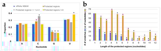 Base composition of the protected regions. (a) Base composition of all the protected regions (orange), the short protected regions (grey), and the long protected regions (yellow) compared to the composition of the NS and M vRNAs (dark blue). (b) Length distribution of the protected regions. Statistical tests of conformity were used to test whether the nt distribution in the protected regions differs from the nt distribution of the sequences of the NS and M vRNAs (a) or whether the observed distribution of the length of the protected regions differs from a random distribution of the protected nts along the vRNA sequences (b). *: p < 0.05.